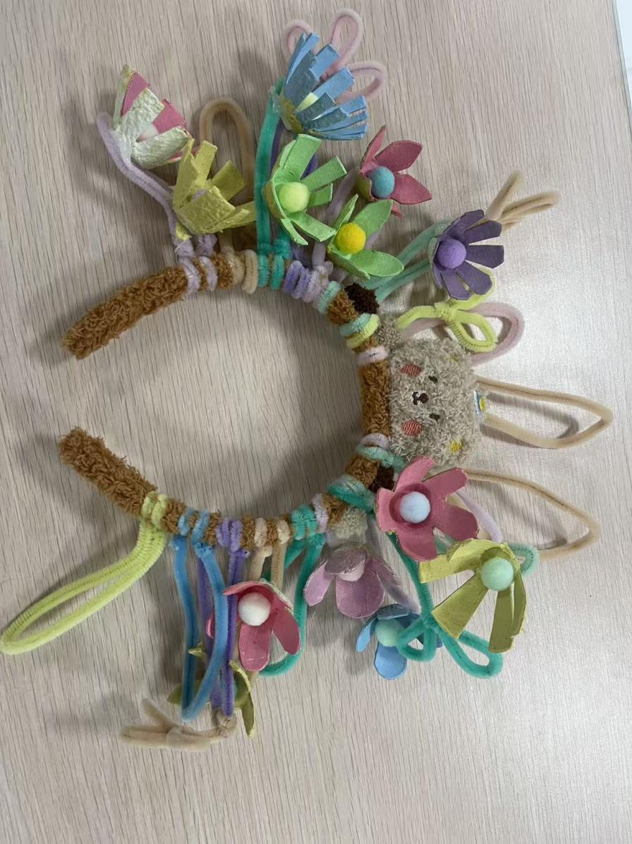 活动伊始,摊位便被闻讯而来的同学们层层围住。在负责同学的耐心指导下,大家迅速投入到“鸡蛋托簪花”的创作中。现场照片记录下了许多专注的瞬间:有的同学小心翼翼地用画笔为剪好的花瓣涂上心仪的色彩;有的同学则巧妙地用扭扭棒在发箍上缠绕、扭折,构建出独特的造型框架;还有三五成群的同学相互协作,讨论着如何将花朵粘贴得更加美观。不一会儿,一件件独一无二、充满巧思的环保发簪便在同学们的巧手中诞生,引来阵阵赞叹。许多完成作品的同学兴奋地戴着发簪在摊位旁的拍照点留念,脸上洋溢着开心的笑容。