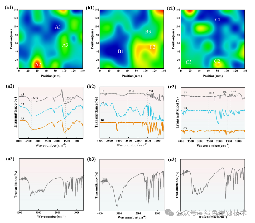 图1 铜片在含有10mM ATA、20mM MT和20mM AMTA碱性介质(0.5 wt%过氧化氢和2 wt%甘氨酸)浸泡后N1-N2键的同步辐射显微红外mapping光谱图(a1-c1),局部FITR光谱图(a2-c3),缓蚀剂粉末傅立叶红外光谱图ATA(a3)、MT(b3)、AMTA(c3)