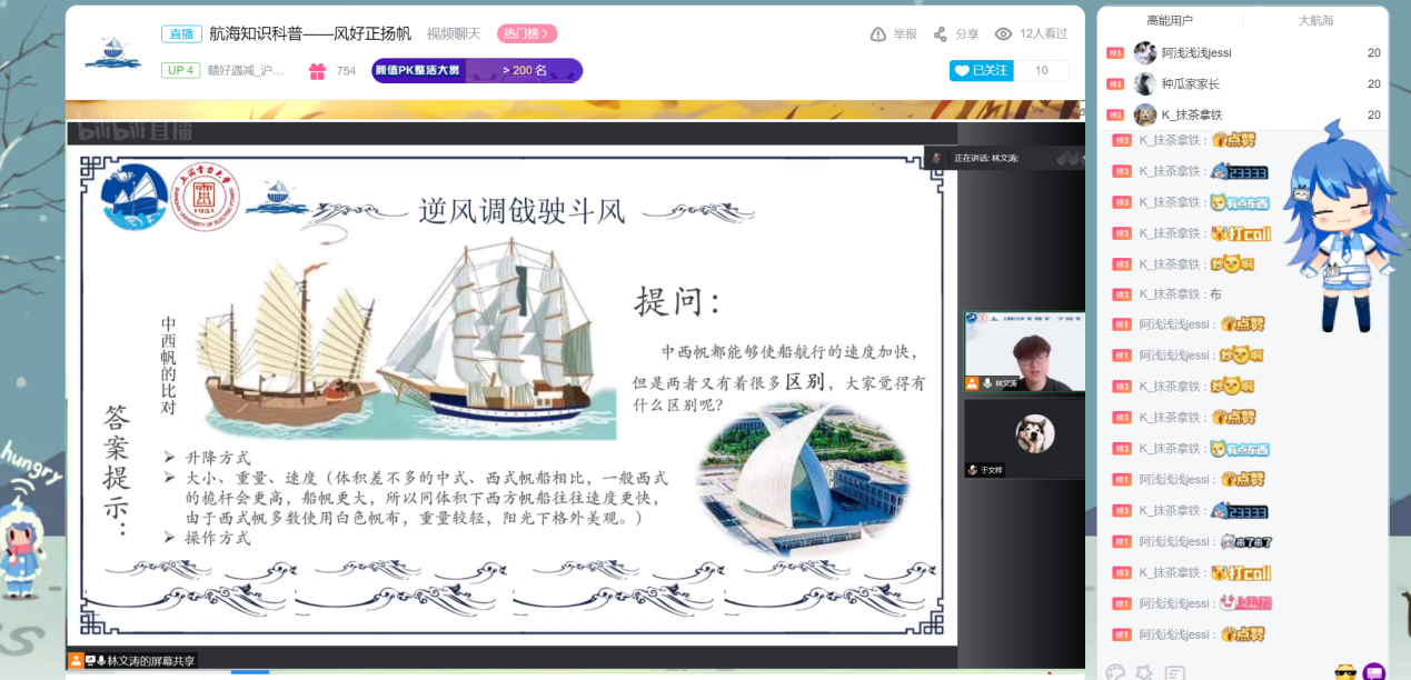 第一讲,实践队结合中国古代航海发展史,为小朋友们介绍了祖国伟大的航海家、世界远航的先驱者——郑和,向同学们科普航海知识,旨在培养青少年对航海的兴趣,从而唤醒新一代航海人的蓝色基因。第二讲讲述了主题为“风好正扬帆”的课程,在授课模式上增加了连麦提问等方式,和小朋友们进行了积极的互动;在授课内容上进一步完善和丰富课程。第三讲结合上海科技节的活动背景,带领小朋友们走进航海奥秘——造船,课程将文字更通俗易懂化。第四讲立足当今时代发展主题,以“人民海军向前进”为主题从“人民海军的诞生、三位重要人物、核潜艇的研制、航母梦、和平年代海军的职责”五个方面,讲述了人民海军的发展历程,让小朋友们学习专家前辈身上不畏艰难、科研报国的伟大精神。